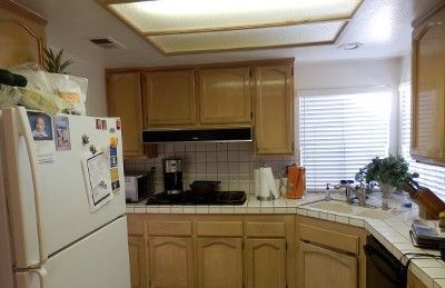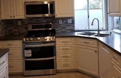 Kitchen remodel featuring existing cabinets reworked, new doors and drawer faces, ceiling reworked for recessed lighting, new counter-tops, appliances, and tile backsplash.